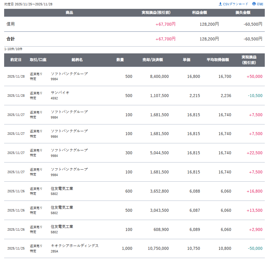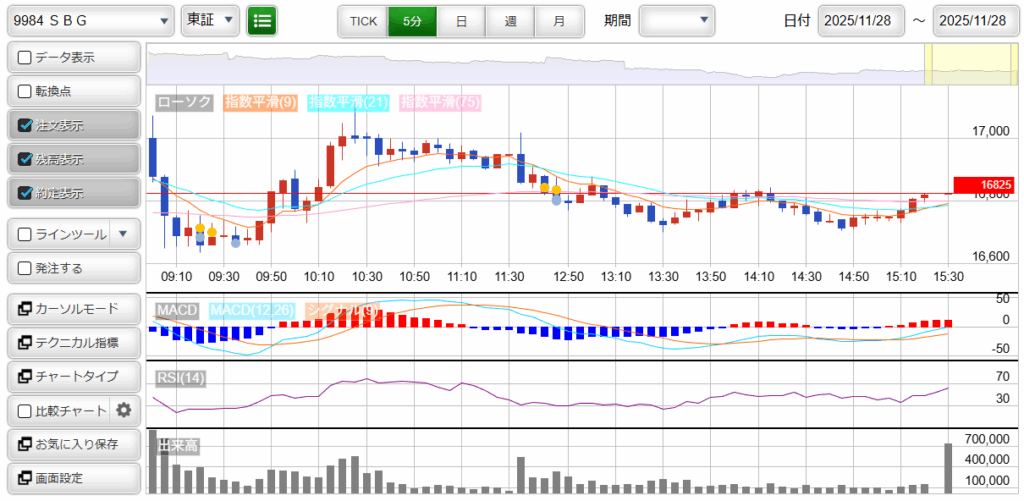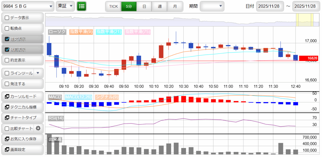 本日の「9984 : ソフトバンクグループ」エントリーでは、含み益が20万ほど出ていました。