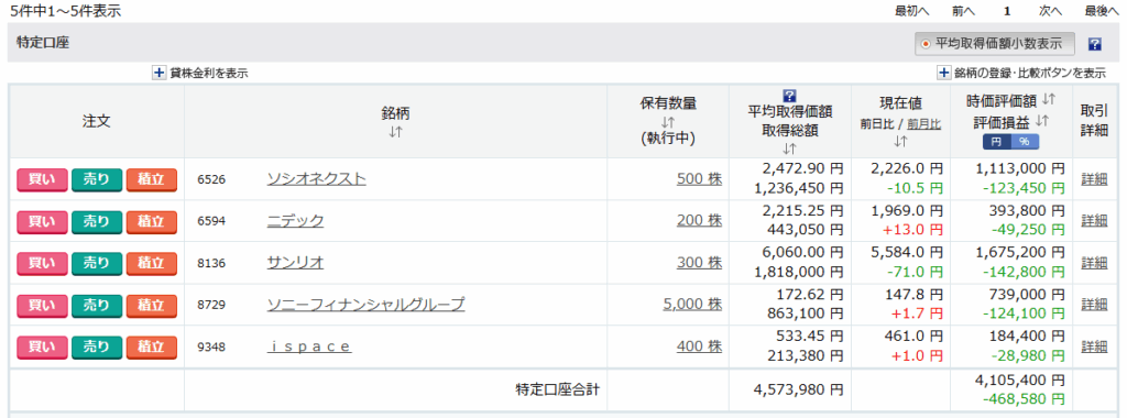 現在の保有銘柄の含み損益は、-468,580 円となりました。前日比 -15,050 円