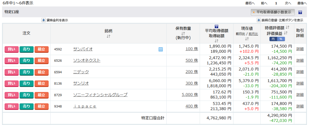 現在の保有銘柄の含み損益は、-472,030 円となりました。前日比 -9,850