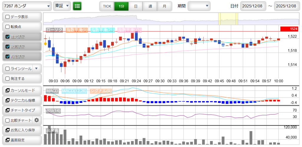 また「7267 : 本田技研」は出来高が乏しく、値動きもそんなにないため、