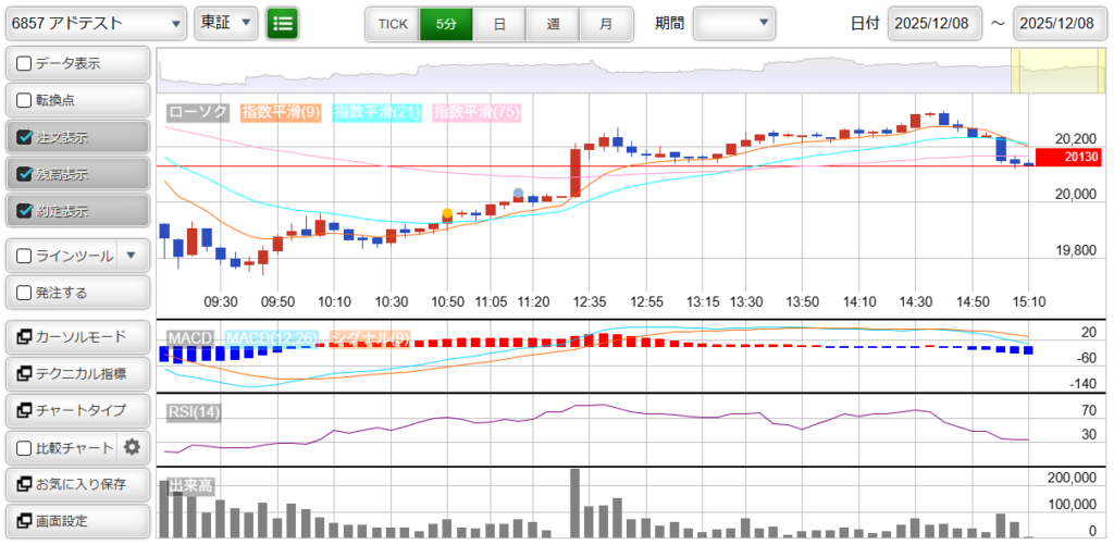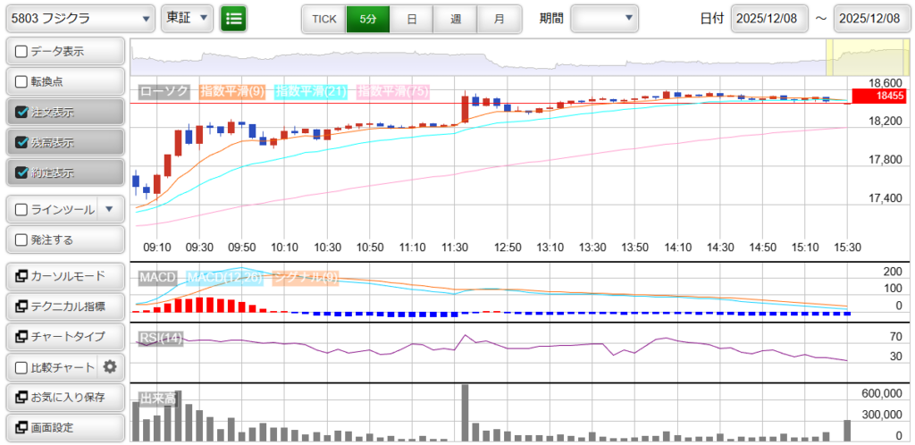 ちなみに、本日「5803 : フジクラ」の5分足チャートは以下の通りです。