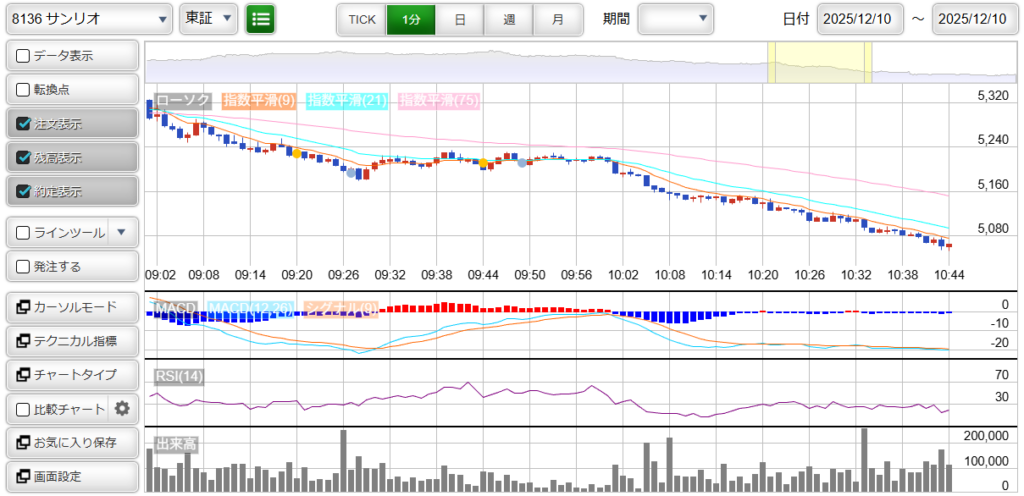 昨日、大きく下げた「8136 : サンリオ」さん。本日も朝から、下がる気満々です。