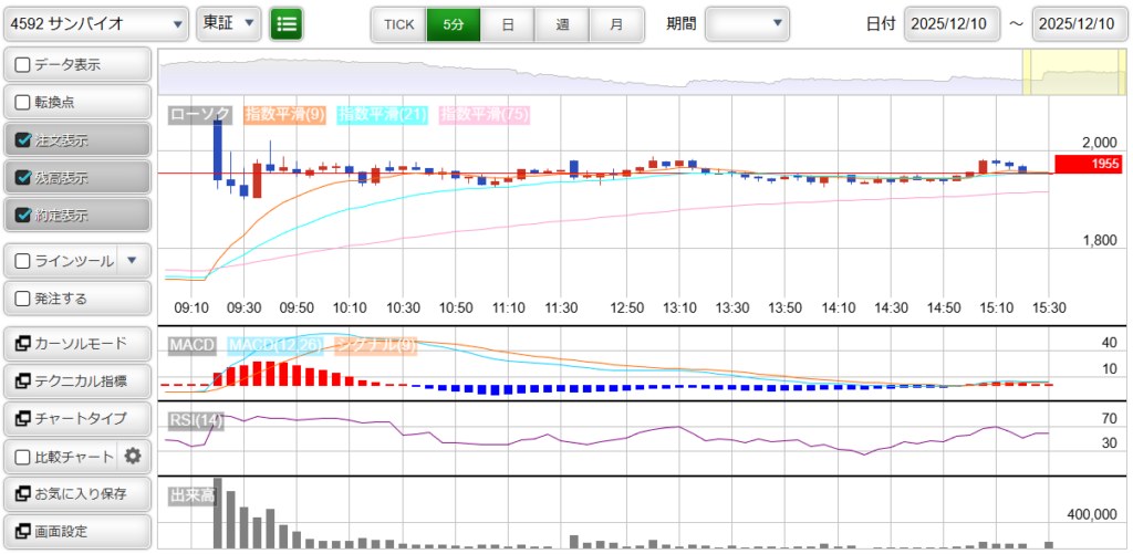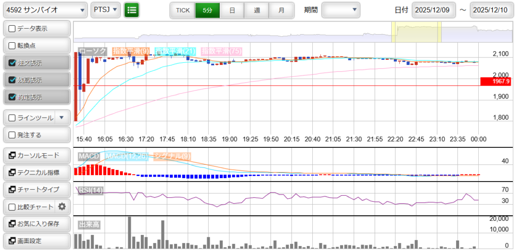昨日の夜間PTSの「4592 : サンバイオ」の5分足チャート
