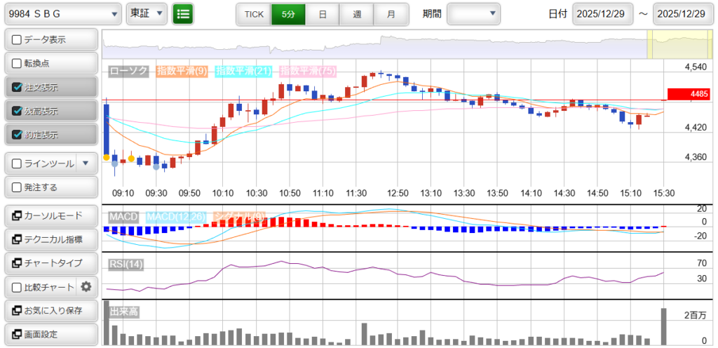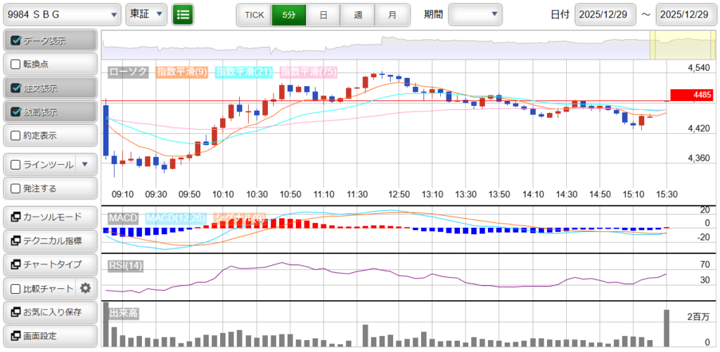 本日から株式が4分割された「9984 : ソフトバンクグループ」…値動きが荒かったです。