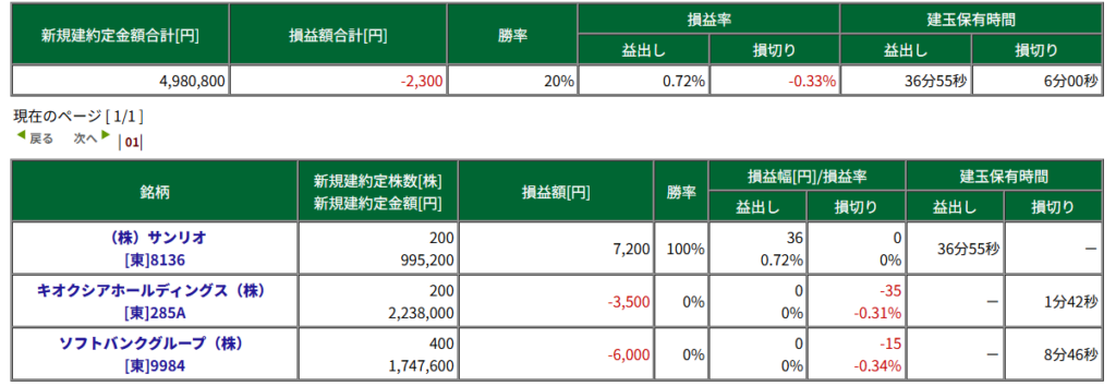本日も、勝率20%と低めです。ここまで低い勝率ですと、リスクリワード1:4でも損益0状態。
