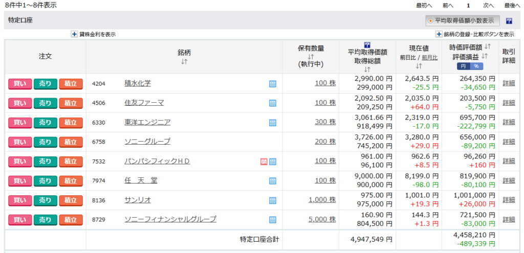 現在の保有銘柄の含み損益は、-489,339円となりました。前日比 +38,990円