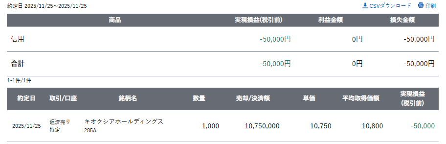 損失 : -50,000 円