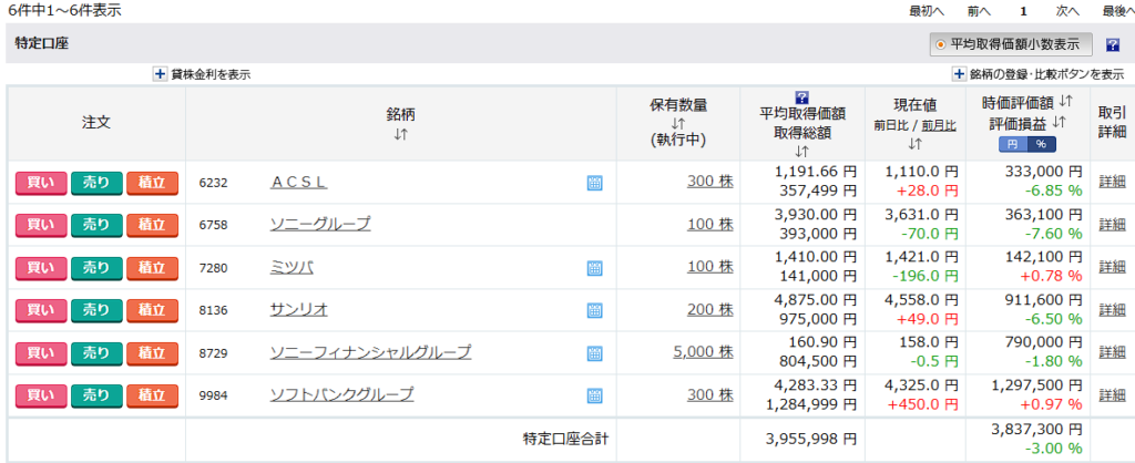 現在の保有銘柄の含み損益は、-119,799円となりました。前日比 +139,250円