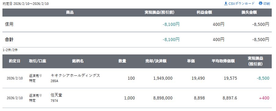 285A : キオクシア 損益 : -6,000円