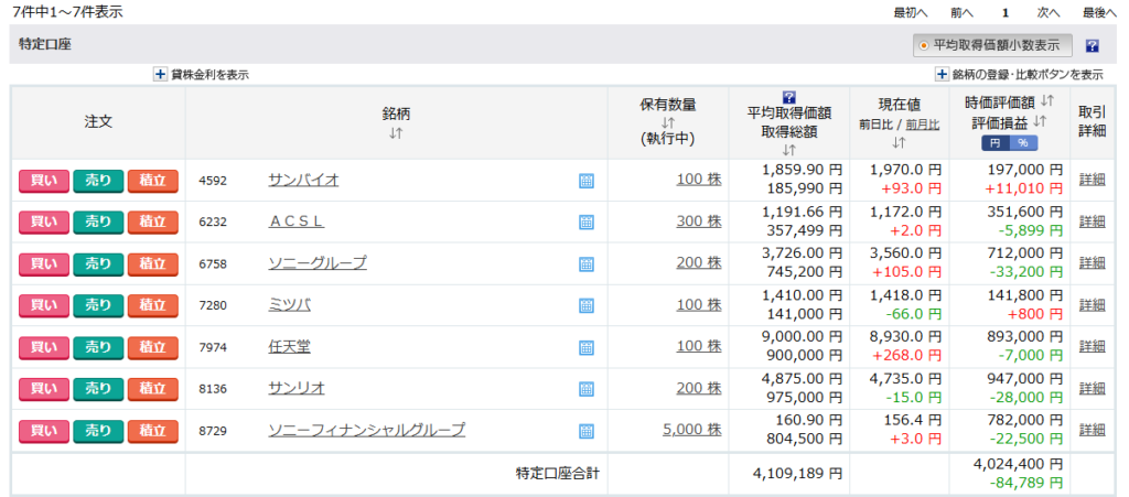 現在の保有銘柄の含み損益は、-84,789円となりました。前日比 +69,700円