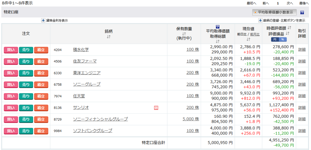 現在の保有銘柄の含み損益は、-49,700円となりました。前日比 +148,150円