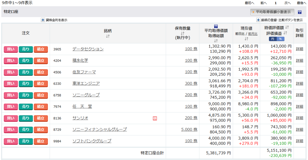 現在の保有銘柄の含み損益は、-230,639円となりました。前日比 +148,951円