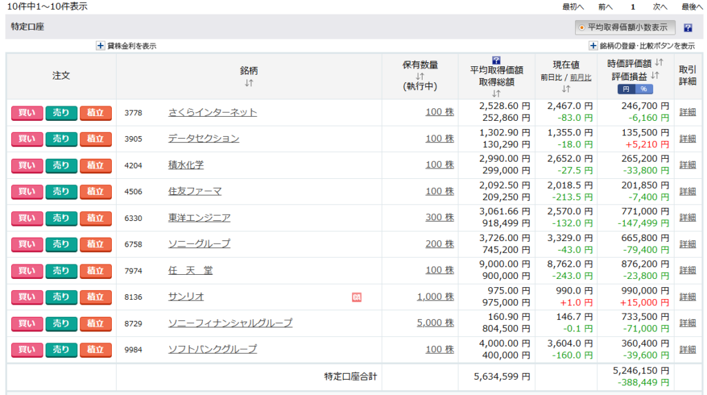 現在の保有銘柄の含み損益は、-388,449円となりました。前日比 -122,200円