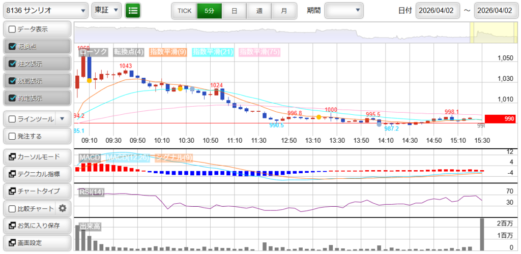 寄付きの急騰後の急落に反発狙いでエントリーするも、株価上昇が見込めないため同値撤退。