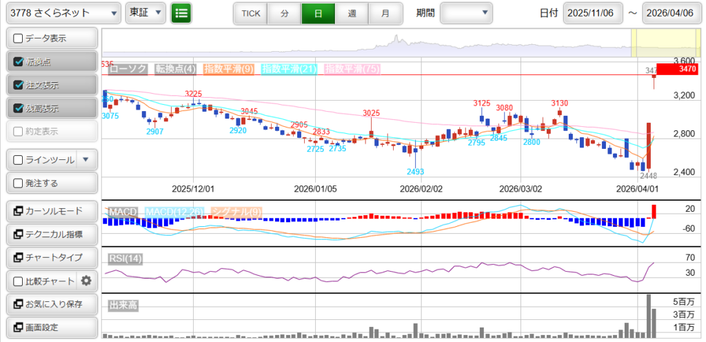 本日は、持ち銘柄は、ほぼ変化なしでしたが、ストップ高2日目となった「3778 : さくらインターネット」を売却した分、含み損が増え、-55万弱となりました。